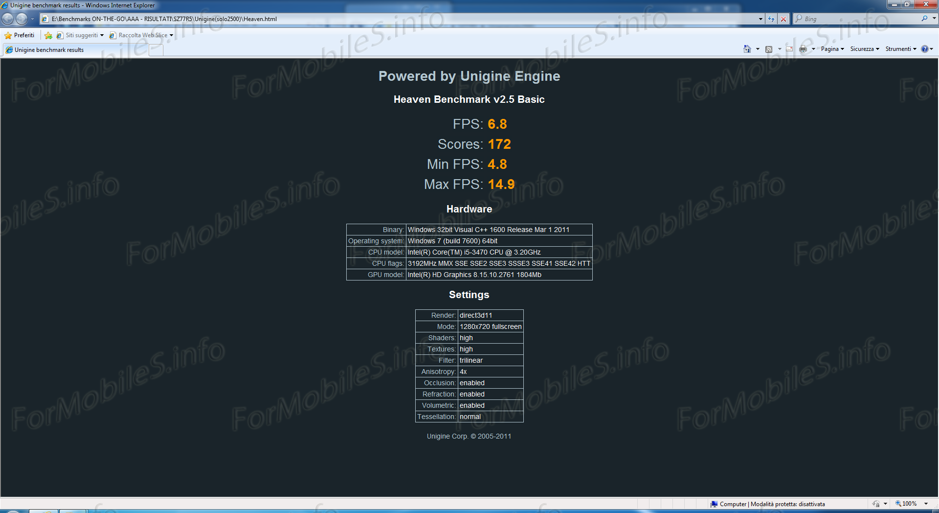 Come già indicato qualche riga fa procediamo ad iniziare i test grafici a 1280×720, fullscreen riconducibile a quello di tanti pannelli TV attualmente sul mercato, e vediamo cosa riesce a fare questa VGA di bordo con il trio Unigine: